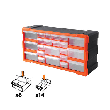 22 Drawers: The storage bin features 22 individual drawers, providing ample storage space for organizing your small parts. The transparent drawers allow for easy visibility, making it simple to locate and retrieve items without the need to open every drawer.