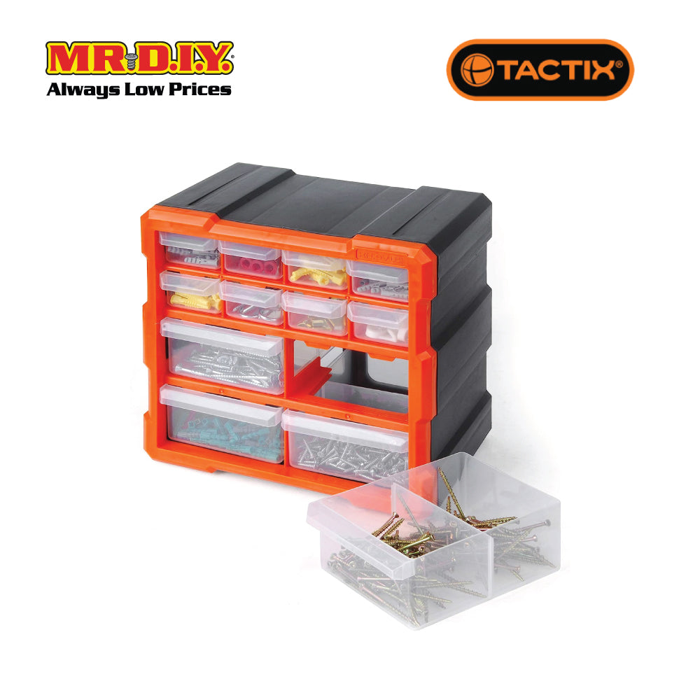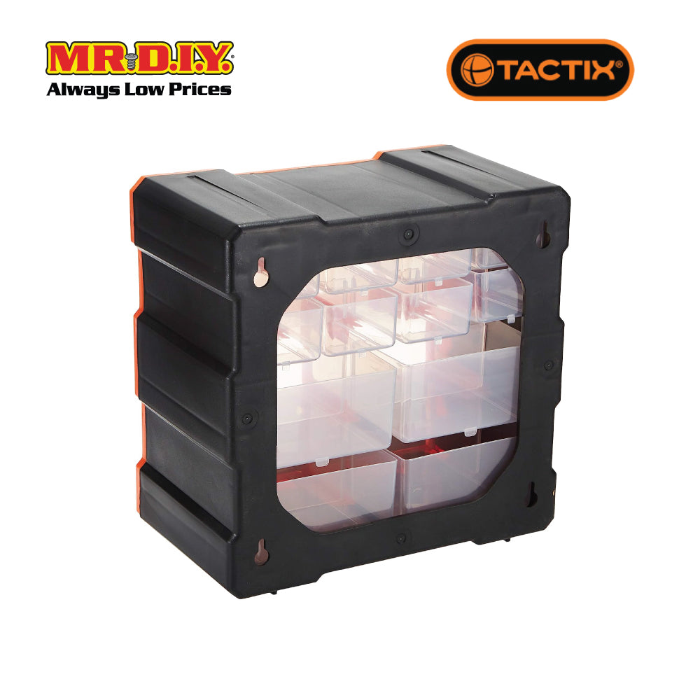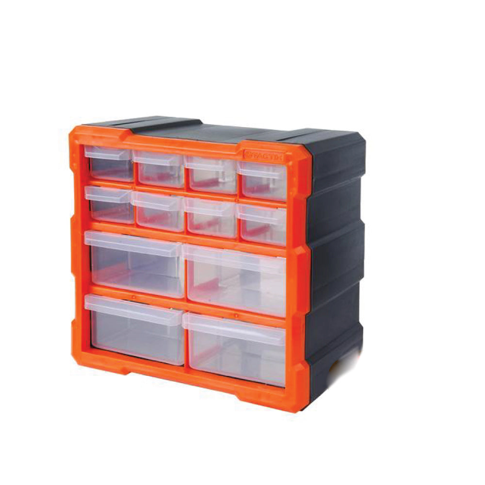 TACTIX 12-Drawers Storage Bin, a compact and efficient storage solution designed to keep your small parts organized and easily accessible. With its thoughtful design and transparent drawers, this storage bin is perfect for various applications. Here are the key features of the TACTIX 12-Drawers Storage Bin: