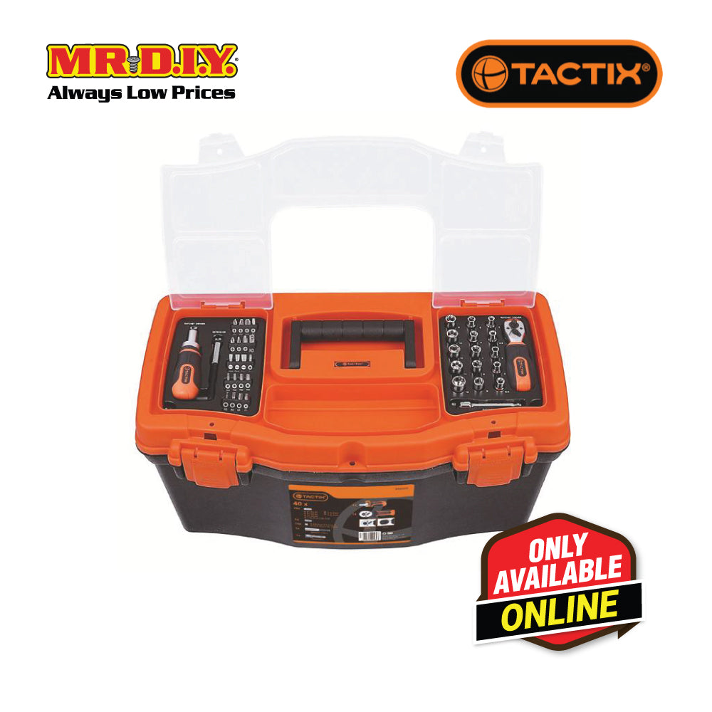 TACTIX Tools and Tool Box set, a comprehensive collection of 40 pieces designed to meet your various tool needs. This set includes a range of bits, sockets, extension bars, ratchet drivers, and a sturdy toolbox for convenient storage and transport. Here are the details of the TACTIX Tools and Tool Box (40 Pieces) set: