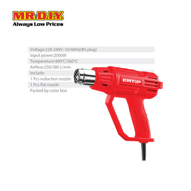 The EMTOP Heat Gun is a powerful and versatile tool designed to provide high-temperature airflow for various applications. Here are the key Specificationss and components of this heat gun: