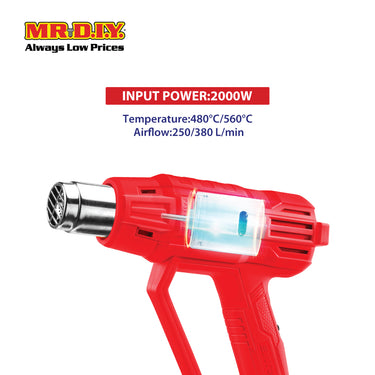 Voltage and Input Power: The heat gun operates at a voltage of 220-240V~50/60Hz, making it suitable for use in standard electrical outlets. It has a powerful input power of 2000W, enabling it to generate intense heat for various tasks.