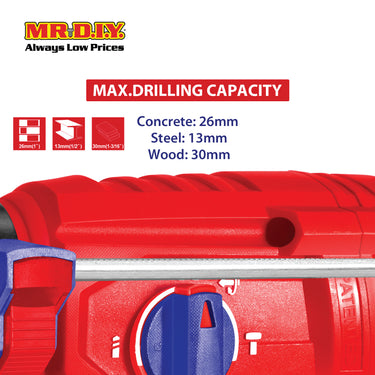 Max. Drilling Capacity: The EMTOP Rotary Hammer excels in drilling tasks, with a maximum drilling capacity of 26mm in concrete, 13mm in steel, and 30mm in wood. This versatility makes it suitable for various projects.