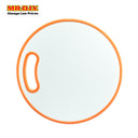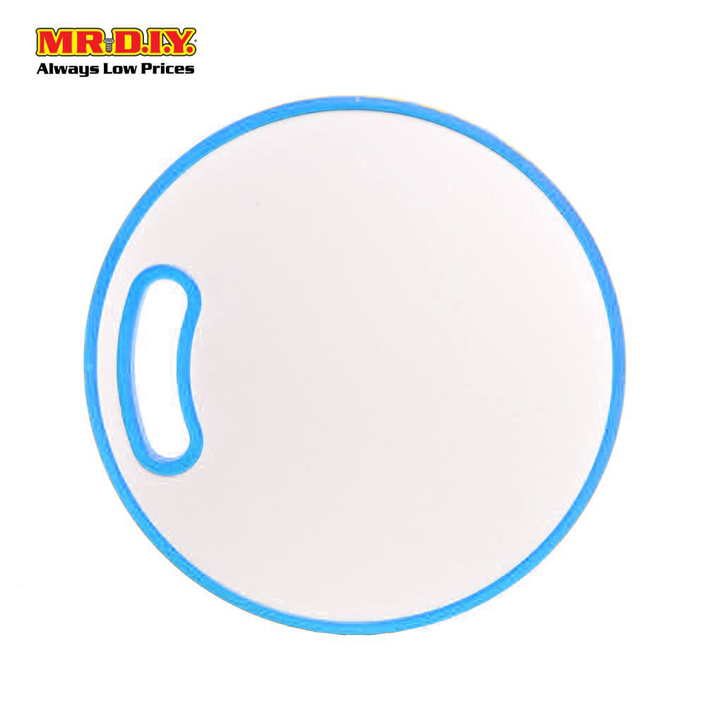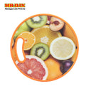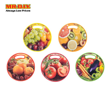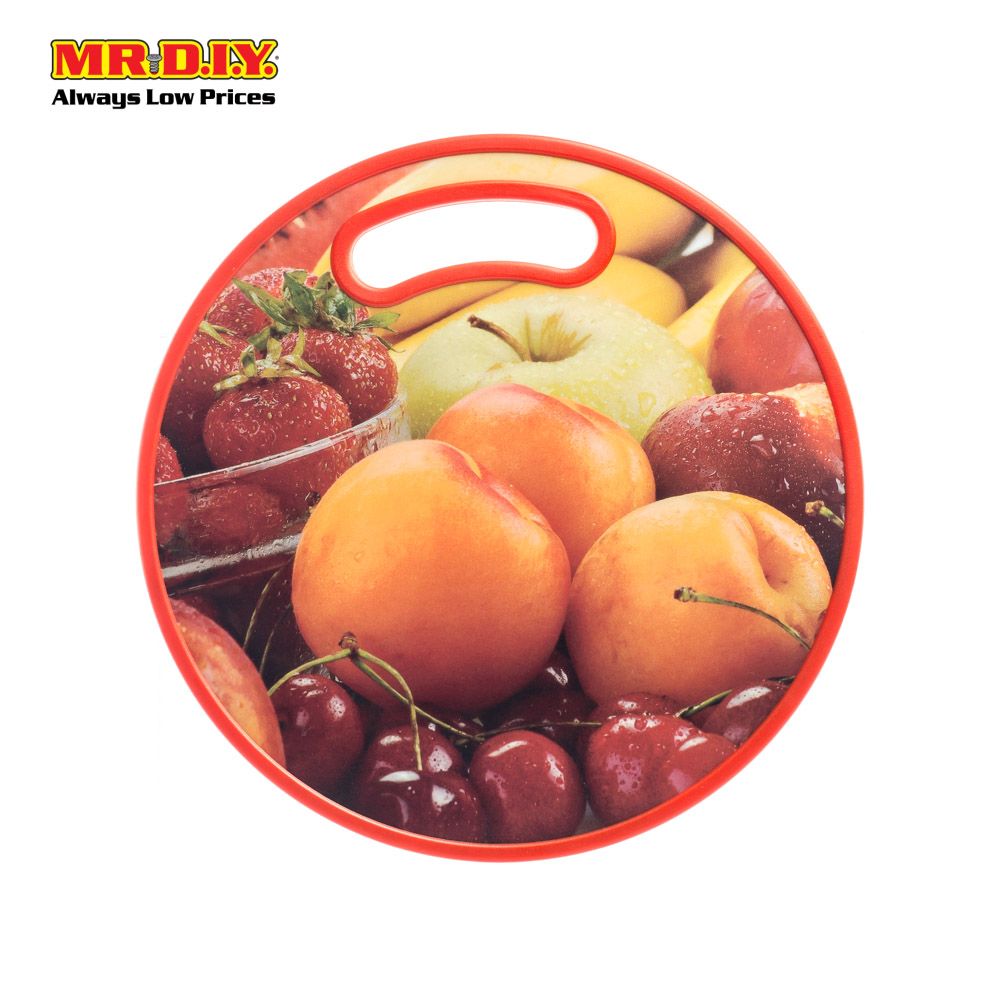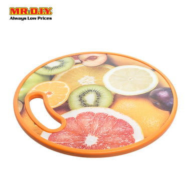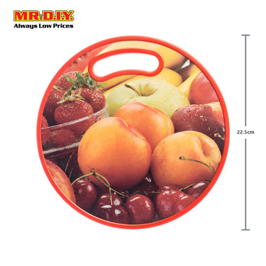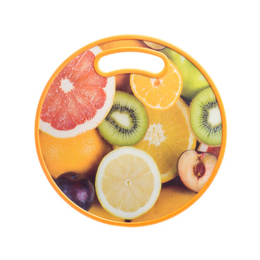 Heavy duty & hard wearing round plastic double sided chopping board featuring a bright fruit graphic.