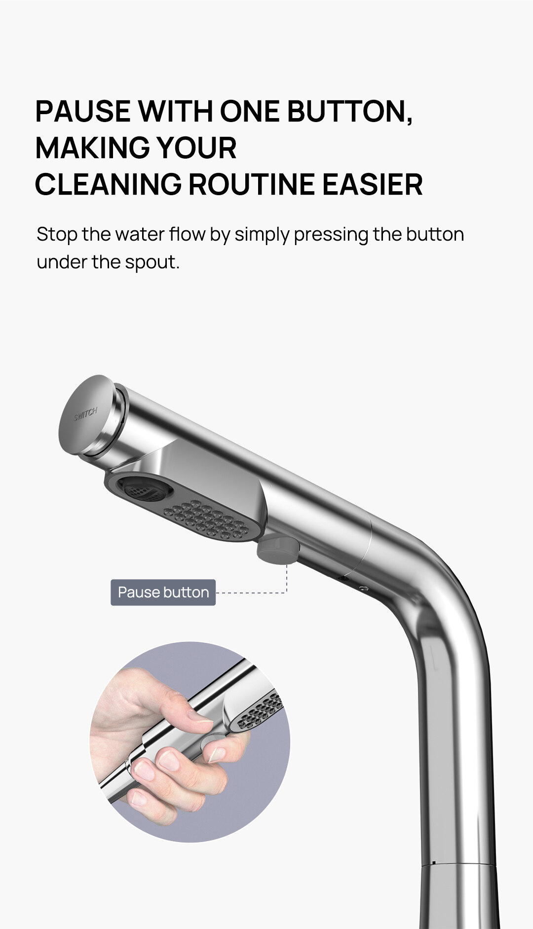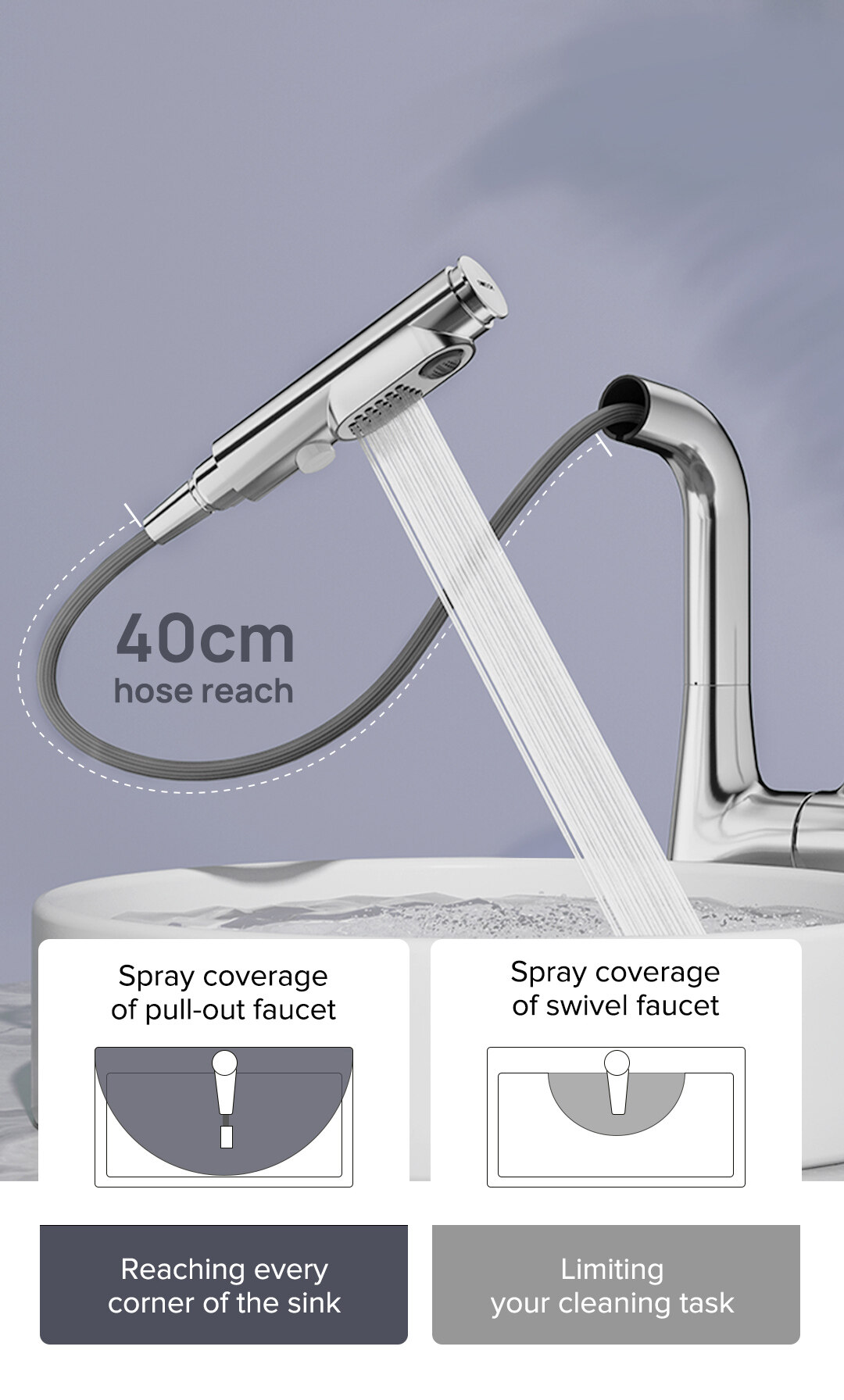Flexible Pull-Out Design – Outlet pipe can be raised and lowered by 90mm, offering extended reach and height adjustment.