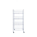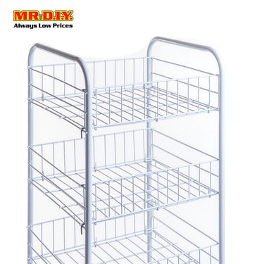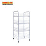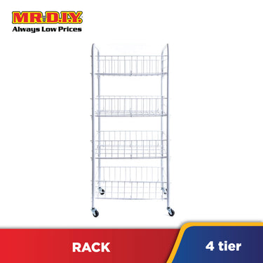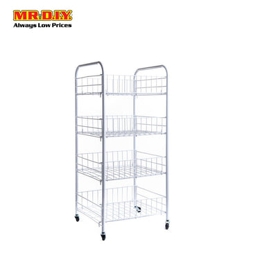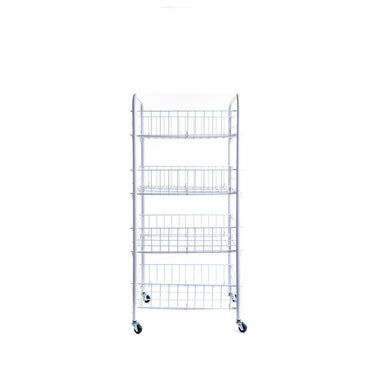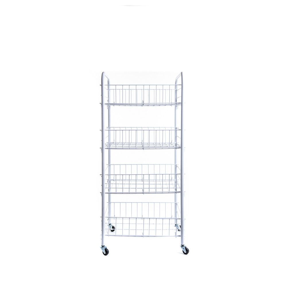 Features:- white wire storage rack with wheels- 4 tiers- easy to assemble & take down for usage/storage- 360