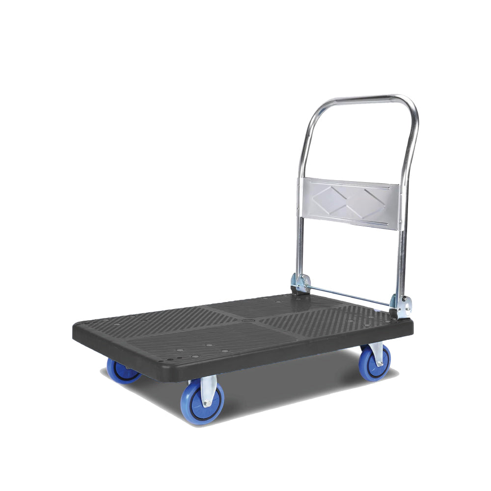 The trolley features a foldable design, allowing it to be compactly stored in tight spaces, such as car trunks, closets, or utility rooms. The quick-fold mechanism ensures effortless unfolding and collapsing for convenient use and storage.