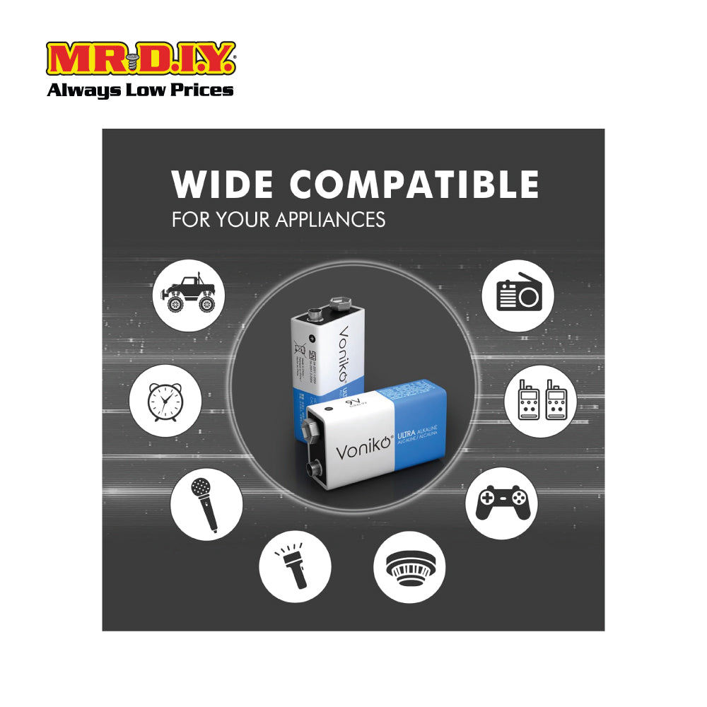 The MR.DIY Voniko Power 9V Battery 6LR61 is a high-quality, long-lasting battery ideal for powering a wide range of household devices, from smoke detectors to toys and remote controls. Designed with safety and performance in mind, this battery provides reliable power and a steady discharge rate.