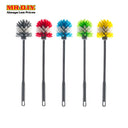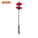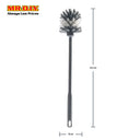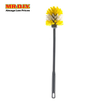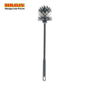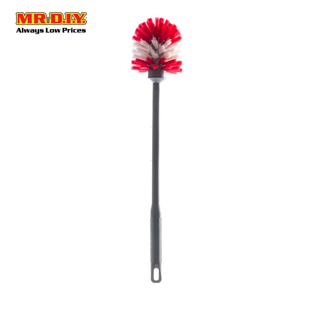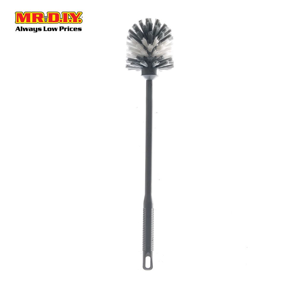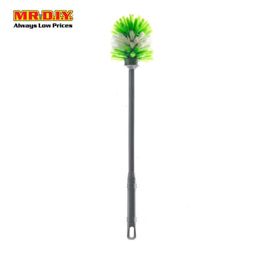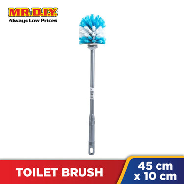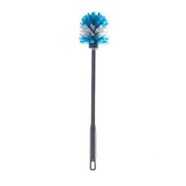 Long plastic handled toilet brush with round head made from stiff nylon bristles.