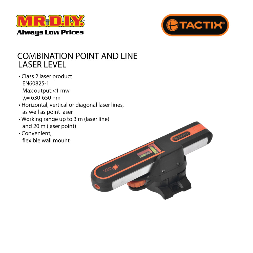 The TACTIX Combination Point And Line Laser Level is a practical tool for professionals and DIY enthusiasts who require precise leveling and alignment. Its combination of laser lines and point, along with the convenient wall mount, make it versatile and efficient for a range of applications.