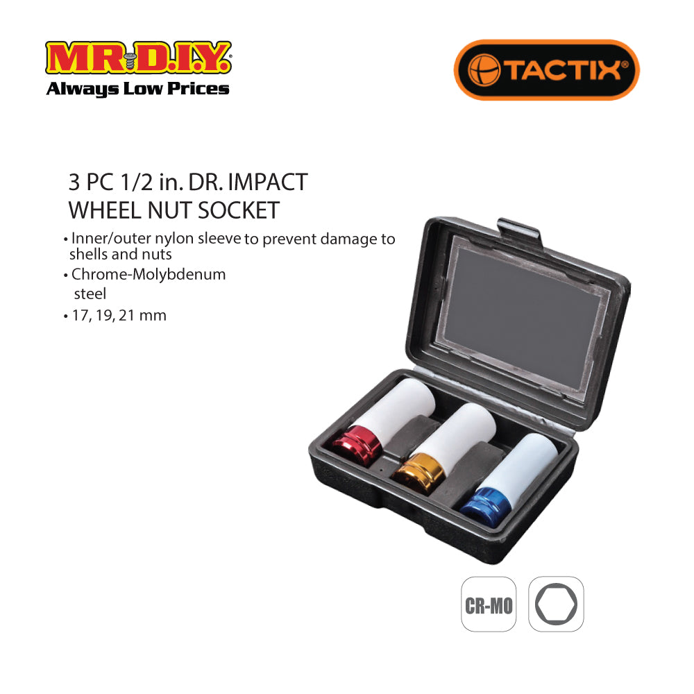 The TACTIX Dr. Impact Wheel Nut Socket set is a high-quality tool designed for use with wheel nuts and lug nuts on vehicles. Here are its features: